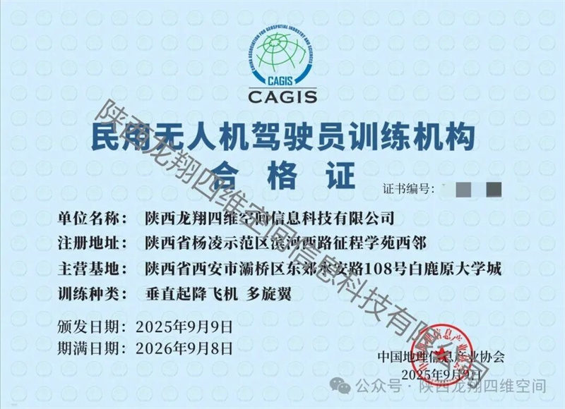 days 09 /12 熱烈祝賀陜西龍翔四維空間信息科技有限公司成功取得民用無人機(jī)駕駛員訓(xùn)練機(jī)構(gòu)合格證! 恭喜陜西龍翔四維空間信息科技有限公司斬獲民用無人機(jī)駕駛員訓(xùn)練機(jī)構(gòu)合格證!這是專業(yè)實力的硬核認(rèn)證,也是信任的基石,愿以此為起……